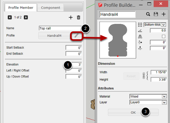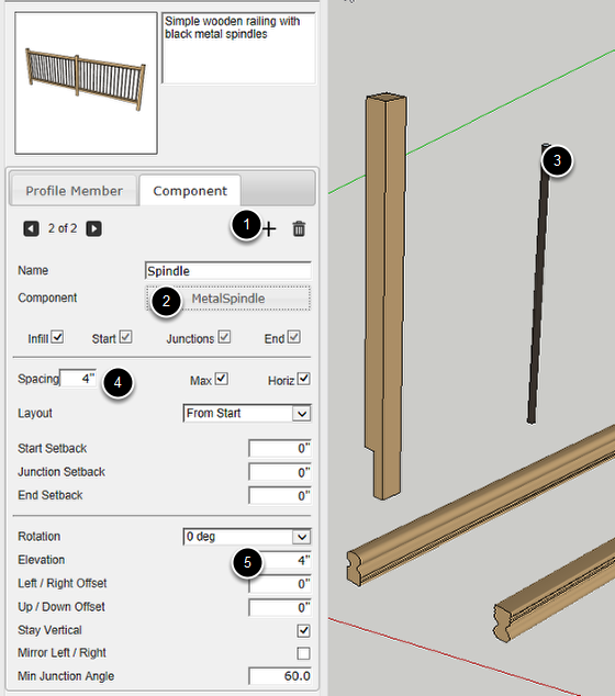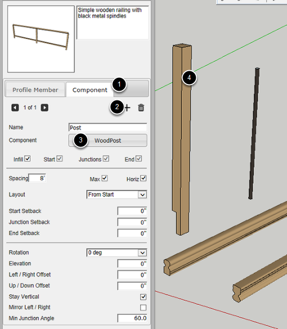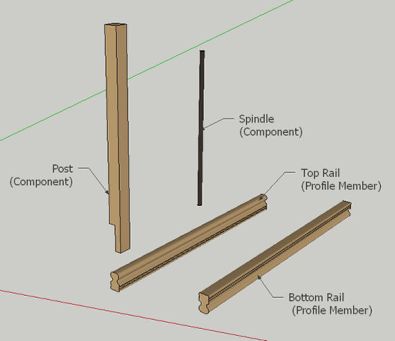 Draw a series of Profile Members and other Components that you wish to use for the assembly. In this example, we will make a railing composed of rails, posts and spindles.